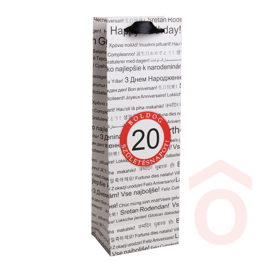 Praktikus mérete (12×36 cm) a magas, karcsú palackokhoz illik, a szalagfül pedig kényelmes és biztos fogást ad. Válasszd ezt a tasakot 20. születésnapra, hogy az ajándék már az átadás pillanatában különleges legyen.