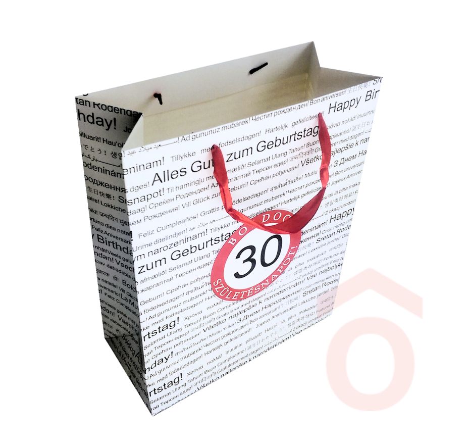 Elegáns, szalagfüles ajándéktasak italos palackokhoz. A letisztult, matt fehér megjelenést a születésnapi „30” felirat teszi ünnepivé – tökéletes borhoz, pezsgőhöz vagy pálinkához.