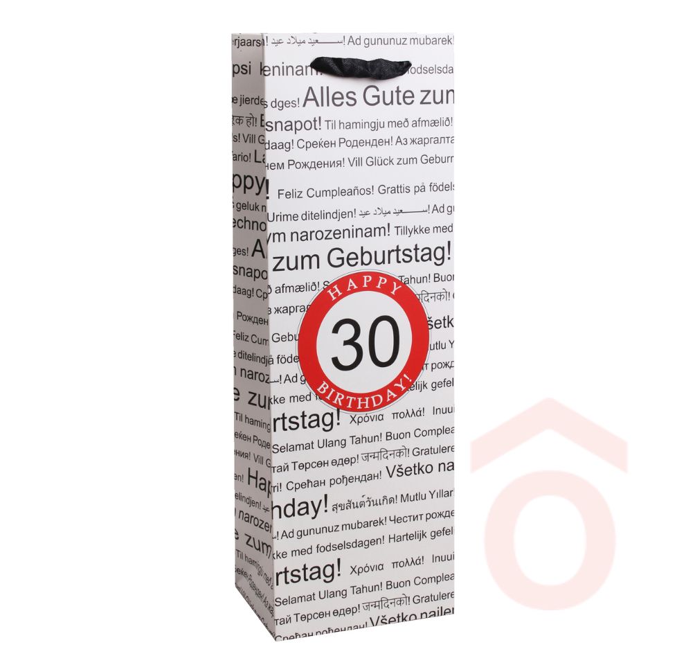 Stílusos, szalagfüles ajándéktasak kifejezetten italos palackokhoz. A letisztult, matt fehér alapot a születésnapi „30” felirat teszi ünnepivé – elegáns, mégis látványos megoldás borhoz, pezsgőhöz vagy pálinkához.