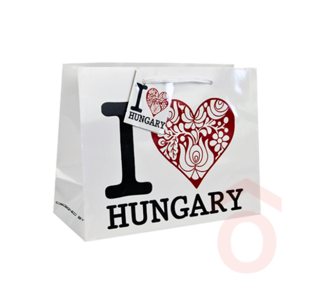 Stílusos, zsinórfüles ajándéktasak „I love Hungary” felirattal. Letisztult fehér alapszínen fekete–piros grafika jelenik meg, amely modern, mégis klasszikus szuvenír–hangulatot ad – tökéletes turistáknak, ajándékozáshoz és hazai emlékként egyaránt.