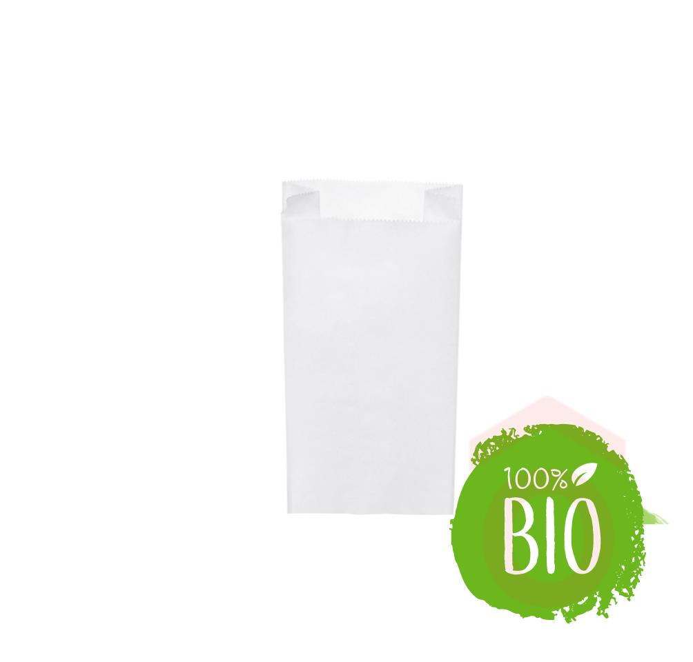 Minőségi, fehér színű papírtasak péksütemények, zsemlék, kiflik és egyéb pékáruk csomagolásához. A tasak lapos aljjal és oldalsó fülekkel rendelkezik, ami segíti a kényelmes töltést és használatot.