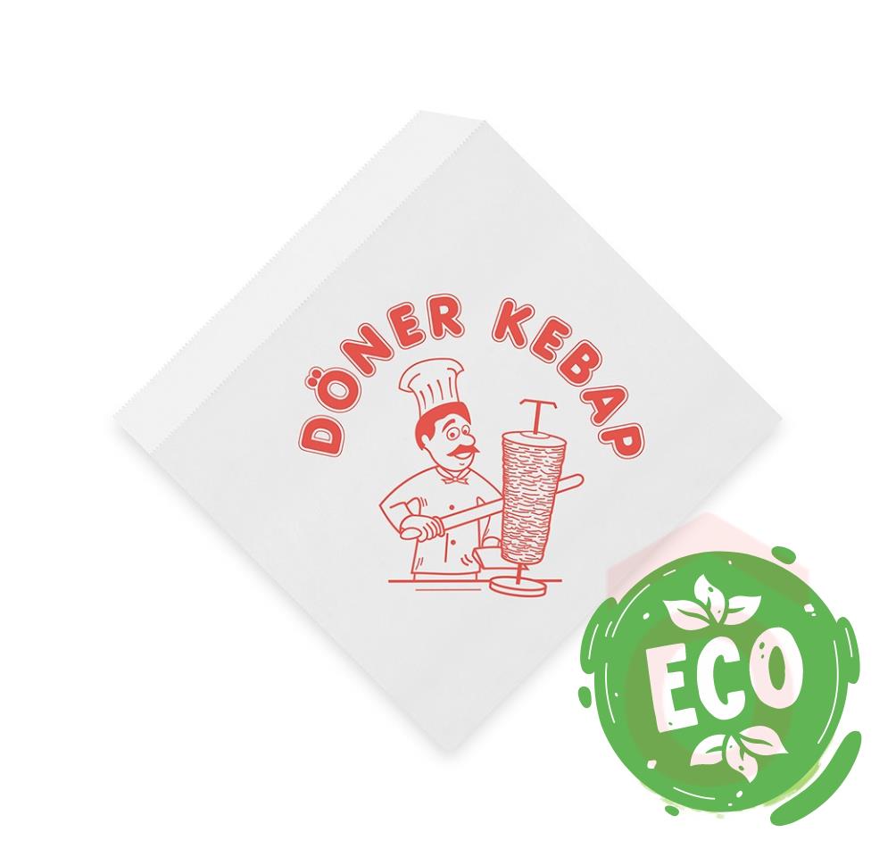 Praktikus és környezetbarát papírzacskó döner kebab, gyros és egyéb street food ételek csomagolásához. A tasak fehér színű, elölapján minta található, amely segíti a termék vizuális megjelenését és a vendégek kiszolgálását.