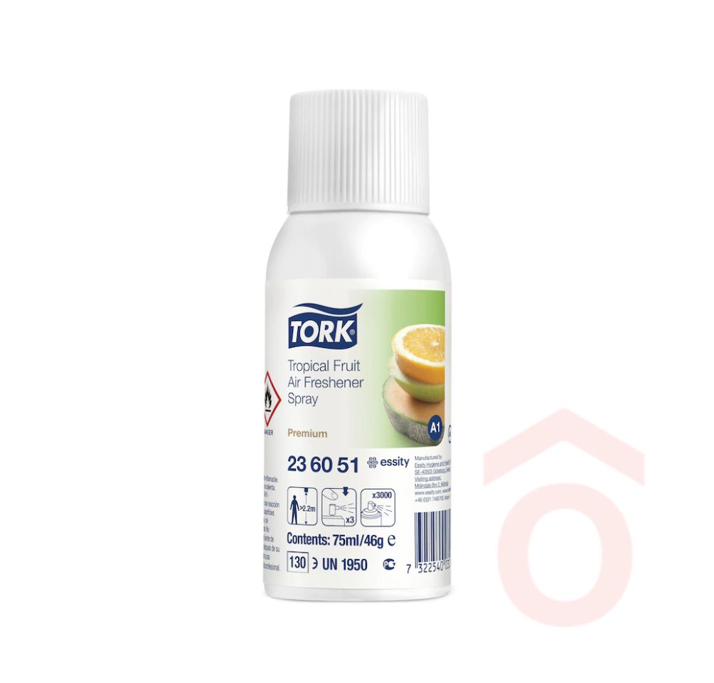 A Tork illatosító spray koncentrált illóolajokat és szabadalmaztatott szagsemlegesítő anyagokat tartalmaz, amelyek hatékonyan szüntetik meg a kellemetlen szagokat és hosszan tartó, friss gyümölcsös illatot biztosítanak. A sprayt Európa egyik vezető parfümgyártója fejlesztette, így garantáltan kedvezõ benyomást tesz a mosdóhasználókra. A patron színváltozással jelzi a csere idejét, így a karbantartás gyors és egyszerű. A sokoldalú felszerelhetõség lehetõvé teszi, hogy szinte minden mosdókörnyezetben alkalmazható legyen.