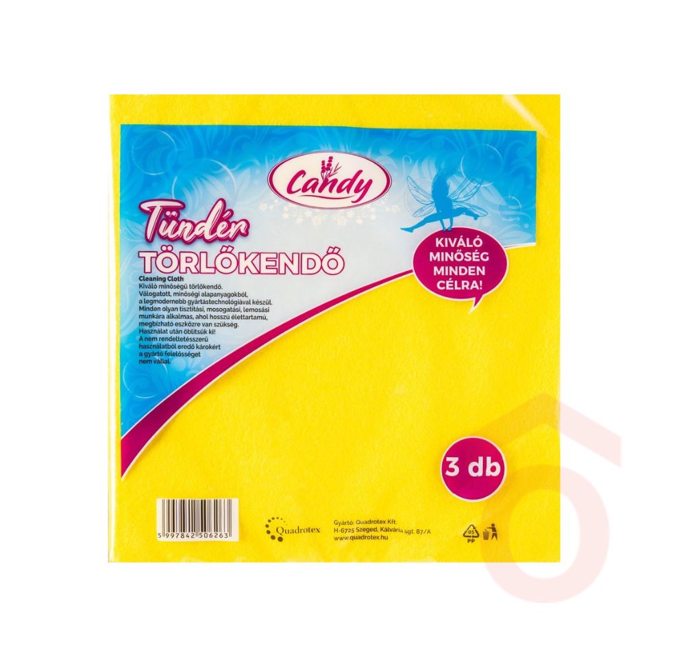 A Candy „Tündér” törlőkendő egy kiváló minőségű, magas cellulóztartalmú kendő, amely kifejezetten általános háztartási használatra készült. Puha, mégis tartós anyaga kiváló nedvszívó képességet biztosít, ezáltal hatékonyan segít a mindennapos tisztítási feladatokban.