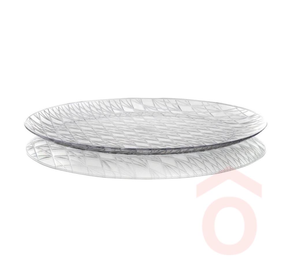 Az ACCASA átlátszó műanyag tálca, dekoratív díszítéssel - alkalmas ételek és italok tálalására, szállítására. 35 cm átmérőjű és 2 cm magas. A tálca nem használható mosogatógépben, mikrohullámú sütőben.