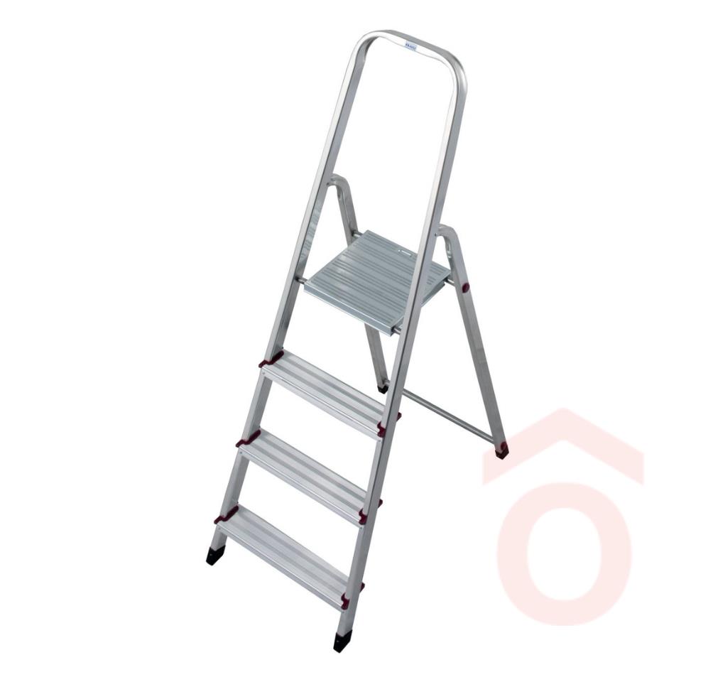 A körbefutó biztonsági korlátkeret, a szegecselt csuklókapcsolatok és a stabil, szegecselt kapcsolat a szárak és a fokok között megbízható szerkezetet biztosít. A bordázott acél dobogó kényelmes állást ad munka közben, a csúszásmentes lábak pedig biztos tartást nyújtanak különböző beltéri felületeken. A 4 fokos kivitel munkamagassága 2,8 m, terhelhetősége 150 kg.
