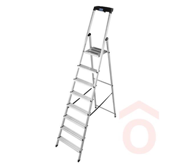 A nagyméretű multifunkciós tálca integrált vödörtartóval és két kábeltartóval kényelmessé teszi a szerelést és a karbantartást. A 250 mm mély, bordázott alumínium biztonsági dobogó csúszásgátló betétekkel, a szárat körülvevő biztonsági csuklórendszer (4CS), valamint a 80 mm mély biztonsági fokok csúszásgátló bordázással mind a stabil használatot szolgálják. A fokok és a szár közötti 6 helyen szegecselt, robusztus kapcsolat és a csúszásmentes lábdugók további biztonságot adnak. Az 8 fokos kivitel munkamagassága 3,7 m, terhelhetősége 150 kg.