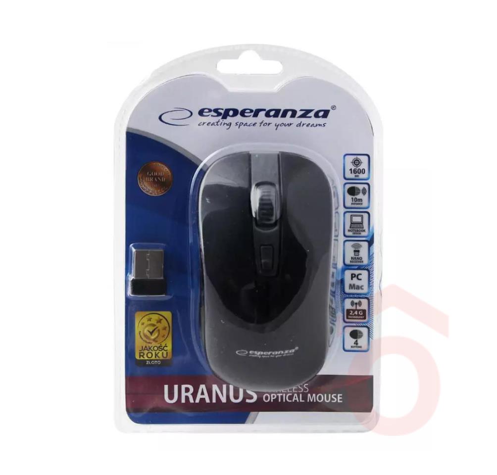 Az Esperanza vezeték nélküli egér egyszerű üzembe helyezést és kényelmes mindennapi használatot kínál otthon, munkahelyen vagy akár útközben is. Kisméretű, formatervezett kivitele miatt hordozható, így könnyen befér laptoptáskába, és gyorsan bevethető, ha egy megbízható egérre van szükség. A csatlakozás USB interfészen keresztül történik, a 2,4 GHz-es kapcsolat pedig stabil vezérlést biztosít mindennapi munkához és böngészéshez.