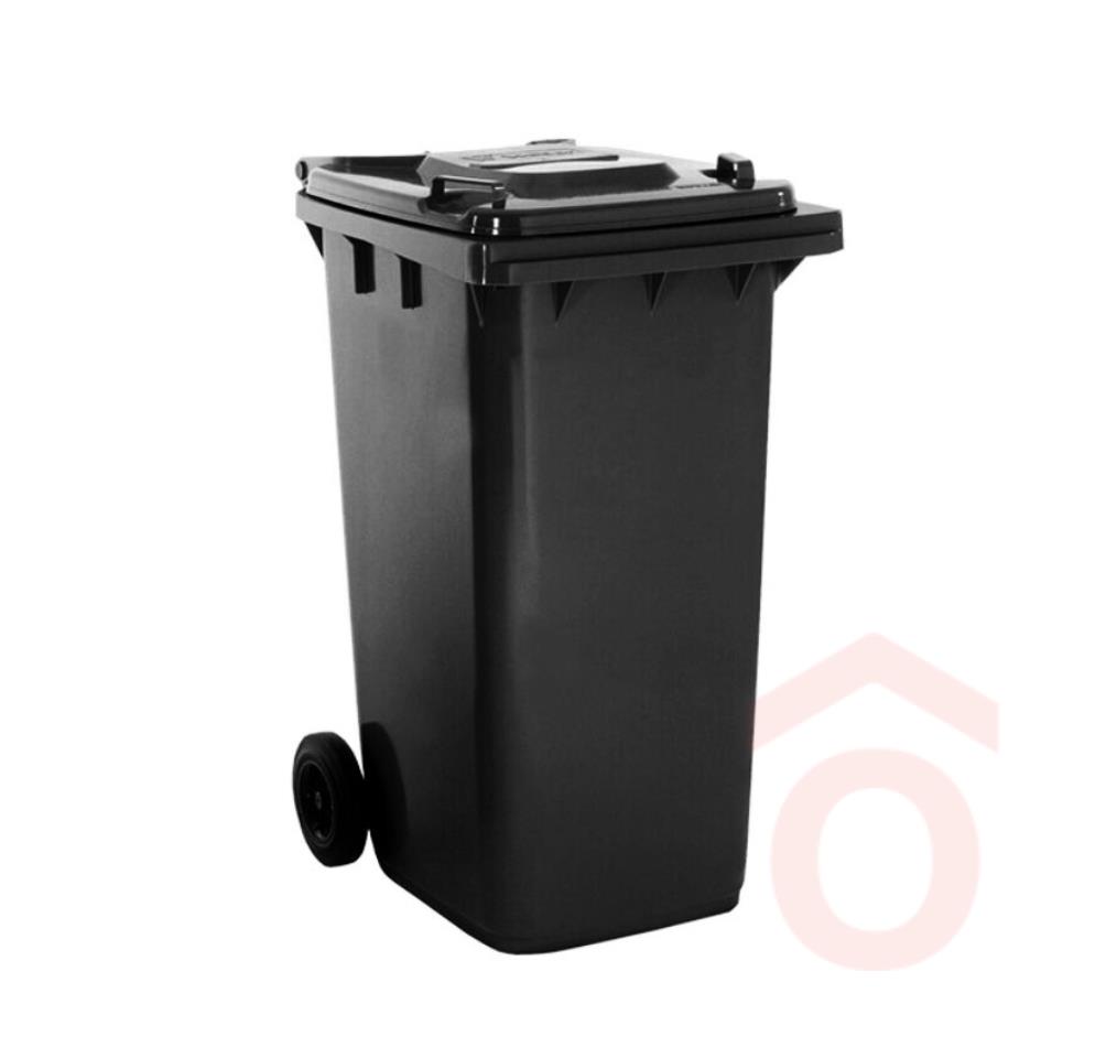 Kommunális, kültéri hulladékgyűjtő kuka, kerekekkel.