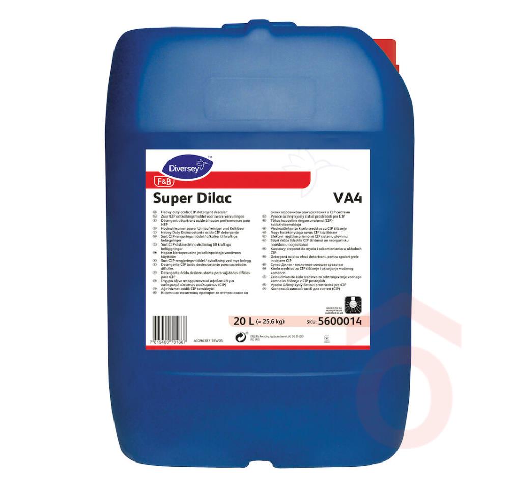 A SuperDilac VA4 egy alacsony habzású, nagy aktivitású savas tisztítószer, amelyet napi és idõszakos alkalmazásra fejlesztettek ki az élelmiszer- és italipar számára. Kifejezetten hatékony szervetlen lerakódások, mint a vízkö vagy egyéb ásványi anyagok eltávolítására.