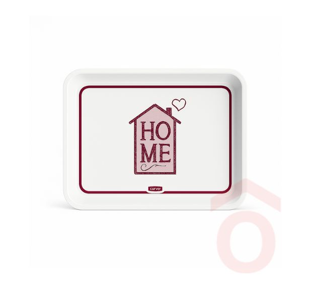 Stílusos HOME II mintás tálca tartós melaminból, 30 × 21,5 cm-es méretben. Kényelmes fogantyú nélküli kialakításával egyszerűen hordozható italokhoz, szendvicsekhez és aprófalatokhoz egyaránt.