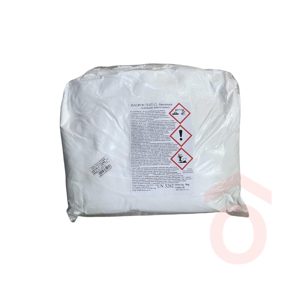 Az Innopon TEXT-CL egy szilárd halmazállapotú, professzionális főmosószer, amelyet fehér pamuttextíliák higiénés mosására fejlesztettek ki. Klórtartalmának köszönhetően hatékonyan távolítja el a makacs foltokat, fertőtlenít és fehérít egy lépésben. Használata különösen ajánlott közösségi és intézményi mosodákban, gyógyfürdőkben, szociális intézményekben, élelmiszeripari, kereskedelmi vagy egészségügyi környezetben. Legalább 60 °C-on fejti ki teljes hatását. Nem alkalmazható gyapjú vagy selyem anyagok mosására.