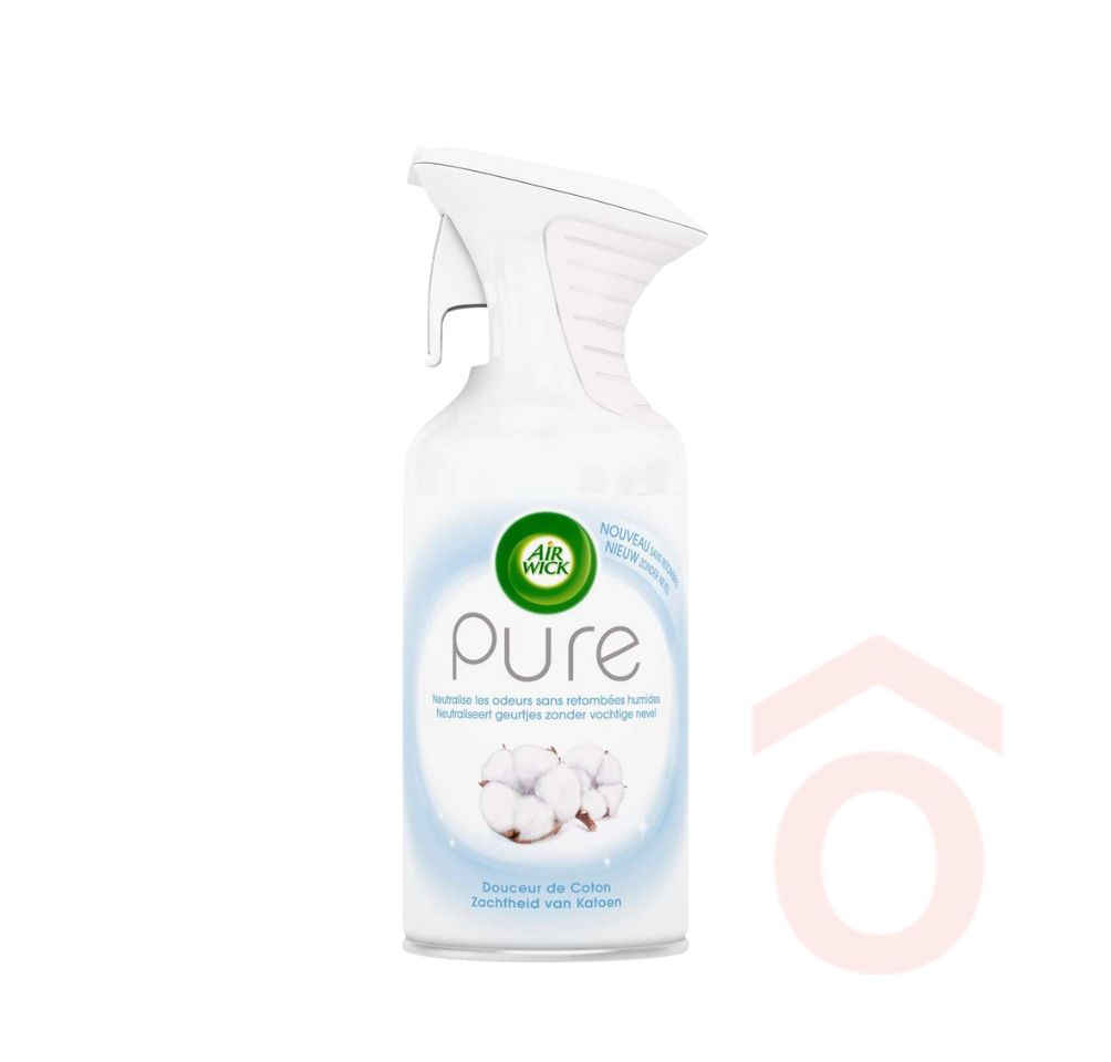Az Air Wick Pure száraz légfrissítő friss pamut illattal ultrakoncentrált formulával semlegesíti a kellemetlen szagokat érintés és permet nélkül. Mivel nem tartalmaz vizet, nem hagy nedvességet a bútorokon vagy padlón – eltérve a hagyományos spray-ktől :contentReference[oaicite:1]{index=1}.