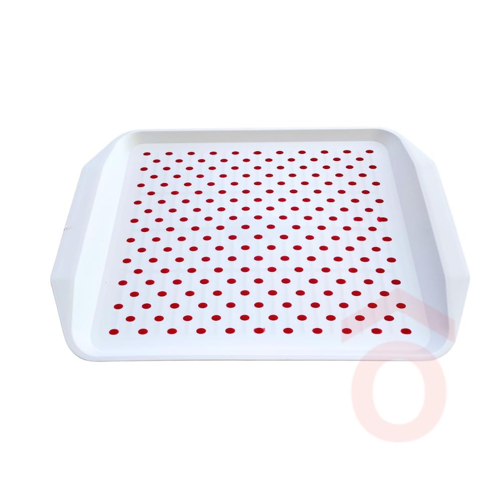 Műanyag tálca, csúszásmentes bevonattal felületén lévő pöttyök tapadnak, nem csúszik. Karcmentes, folyékony mosogatószerrel tisztítható.