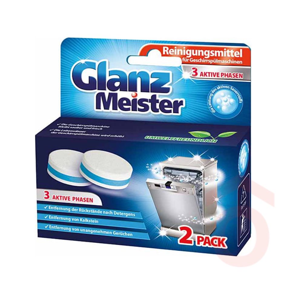 A Glanz Meister mosogatógép tisztító tabletta aktív oxigén formulájával hatékonyan eltávolítja a mosogatógép belső alkatrészeiről a zsírt, vízkövet és egyéb szennyeződéseket. Segít megszüntetni a kellemetlen szagokat, és tisztán tartja a gépet.